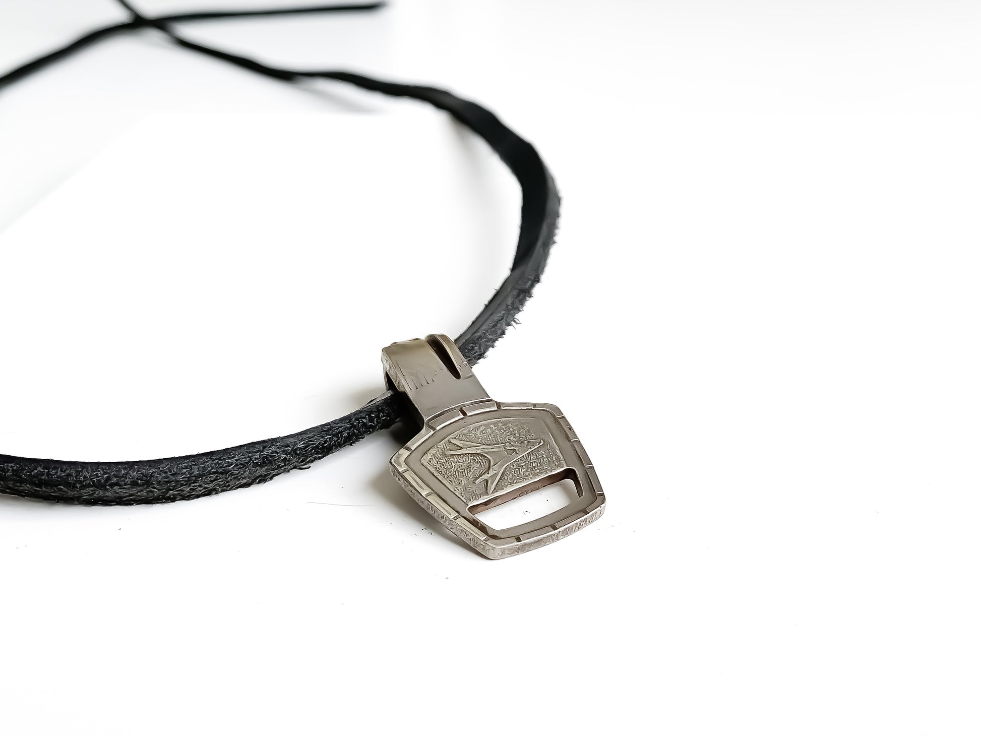 This one-of-a-kind 'AV' JoJo Wrap pendant is perfect for any car lover. You can choose between brown or black leather for this wrap.