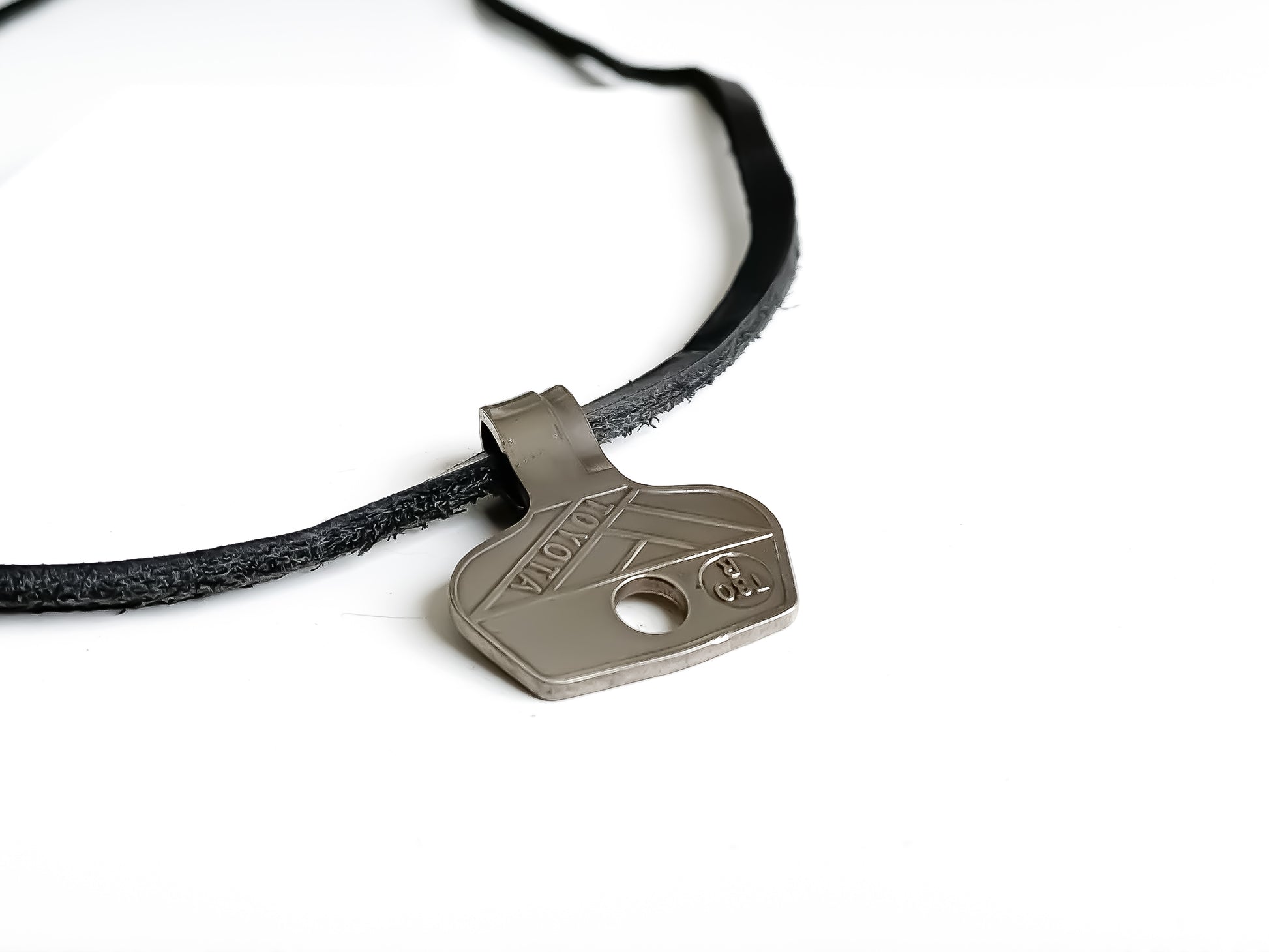 This one-of-a-kind chevron patterned 'Toyota' JoJo Wrap pendant is perfect for any car lover. You can choose between brown or black leather for this wrap.