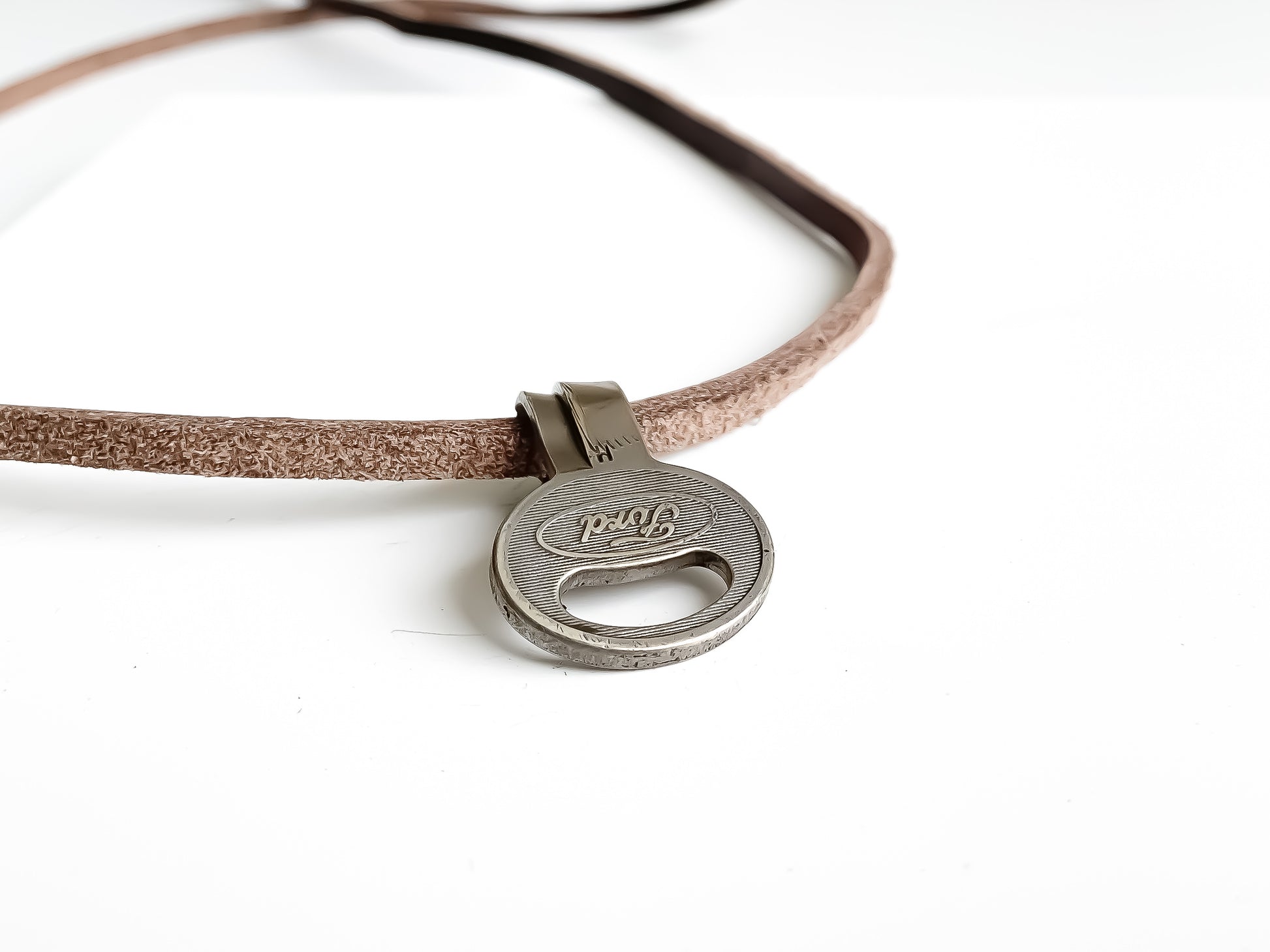 This one-of-a-kind classic circle 'Ford' JoJo Wrap pendant is perfect for any car lover. You can choose between brown or black leather for this wrap.