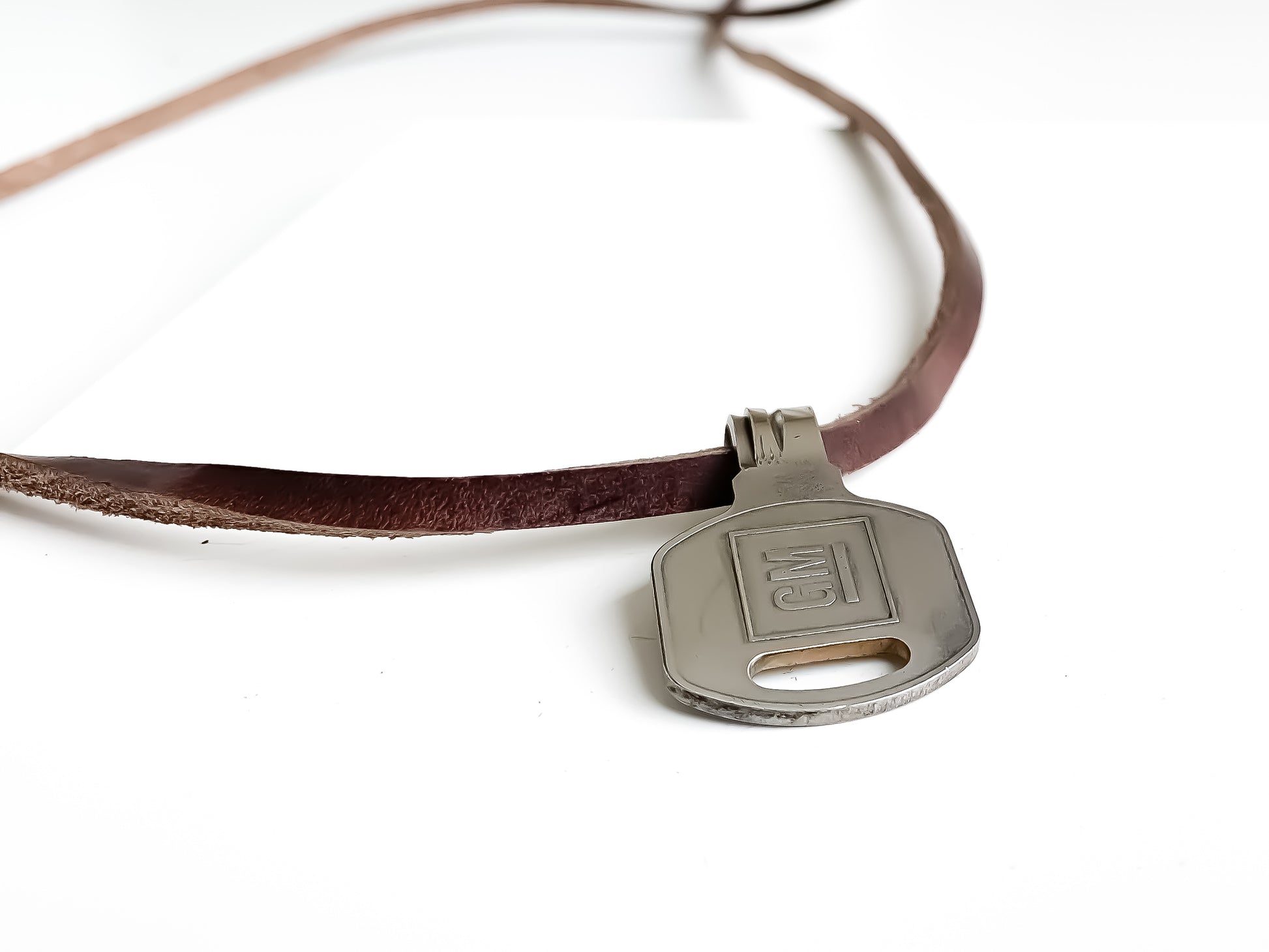 This one-of-a-kind large 'GM' JoJo Wrap pendant is perfect for any car lover. You can choose between brown or black leather for this wrap.