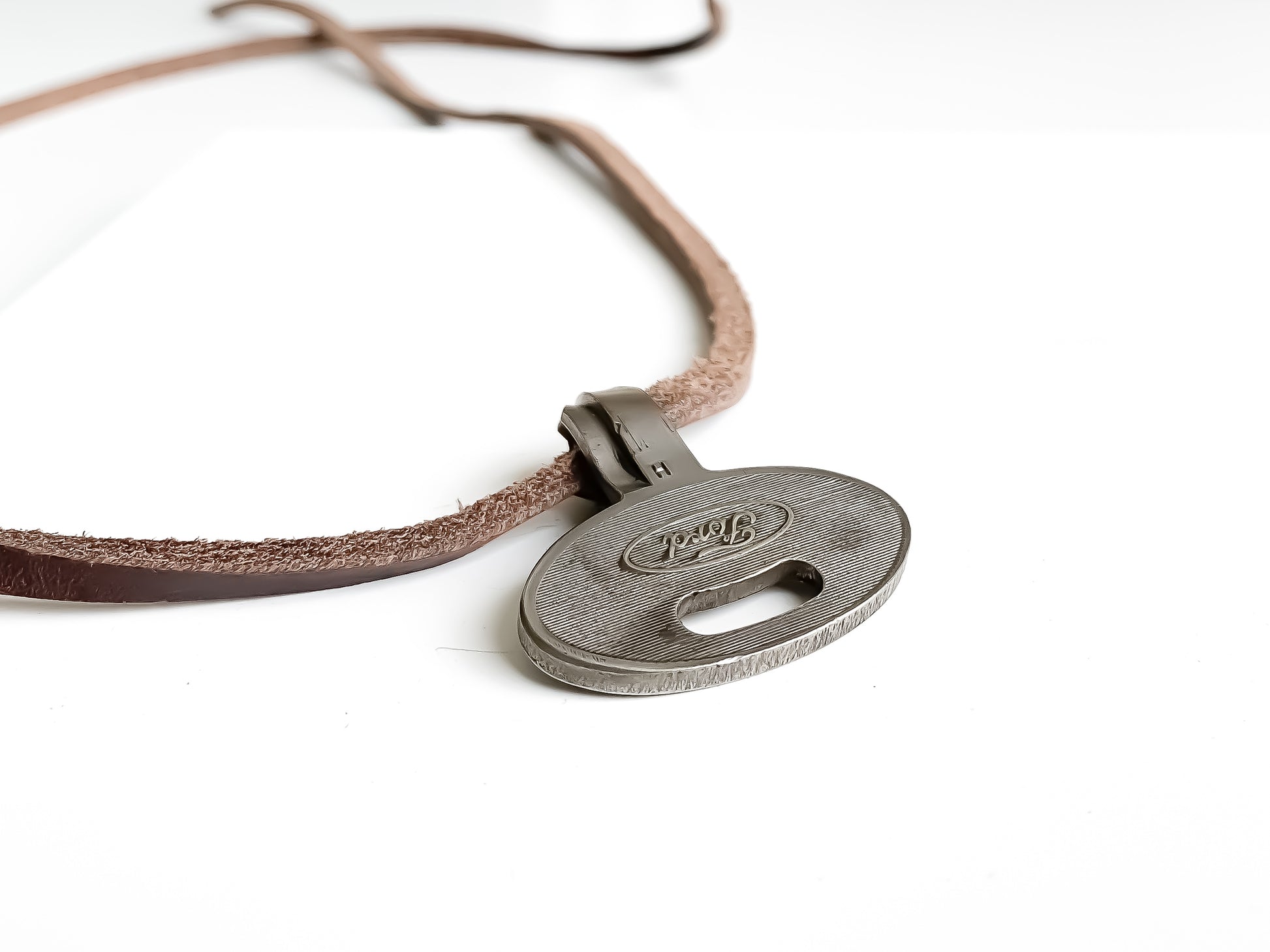This one-of-a-kind large oval shaped 'Ford' JoJo Wrap pendant is perfect for any car lover. You can choose between brown or black leather for this wrap.